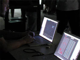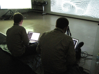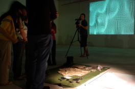 The idea for the performance was to relive and express the moments and discoveries during the reef-walk at kusu. a new sound engine was written in java, which was combined with the previous drum machine software. one projection consisted of photographs which were tagged by their locations and time (the information about where and when the pictures were taken were also displayed in sync with the photos on the screen) following the video documentation of the life forms. next to this was a projection of our journal and various synthetic forms which revealed some of the discoveries from the intertidal landscape. Image by emma ota, more image are archived in the dislocate flickr group