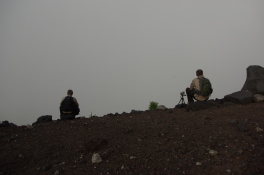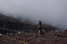 On july 27th 2007, we walked on the fuji mountain. we arrived at 1:20pm local time and started on 2300m above sea level. air is thin and sharp. the soil is volcanic. we are walking on the inner parts of the earth's gut that erupted in 1708 during the edo period. there are several layers in its strata. new fuji is believed to be formed around 10,000 years ago on top of the old fuji which dates around 100,000 years. also, its basalt layer is about several hundred thousand years old and when you walk on this active strato-volcano, you constantly feel, inhale, and are aware of fuji's dust and it is a bit hard to breathe. the wind is making it cold. mist. we are in the cloud almost non stop. then, it's gone. sunshine and the wind. rocks are slippery.
